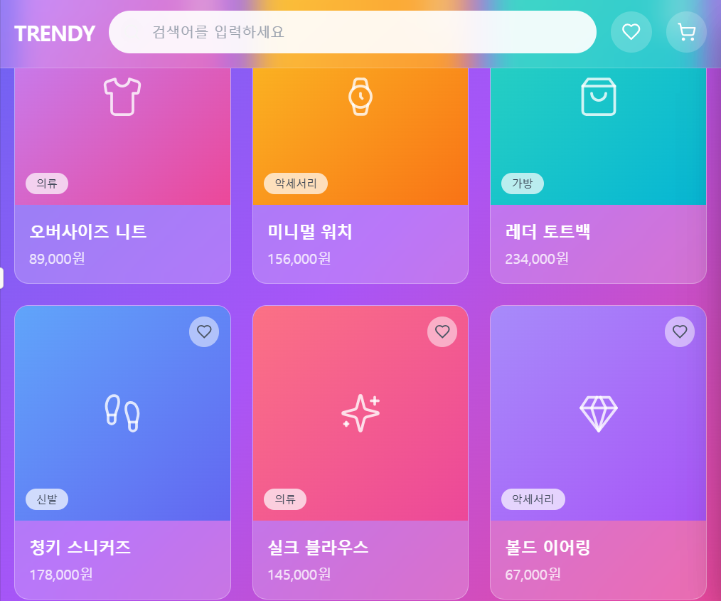 | What? (기능) | 검색바, 2행 3열 레이아웃 (6개 제품), 제품 카드 팝업, 찜목록 및 장바구니 |