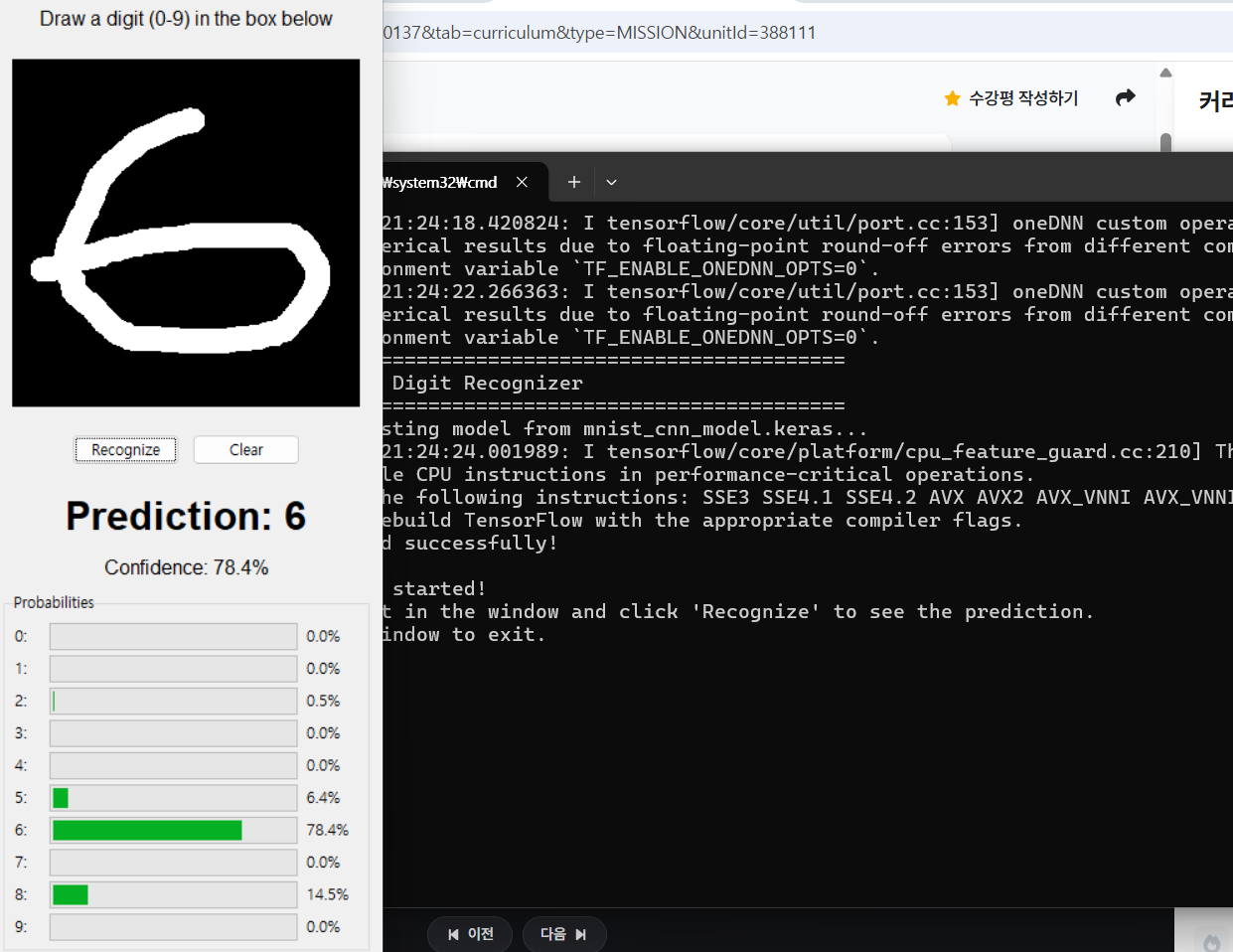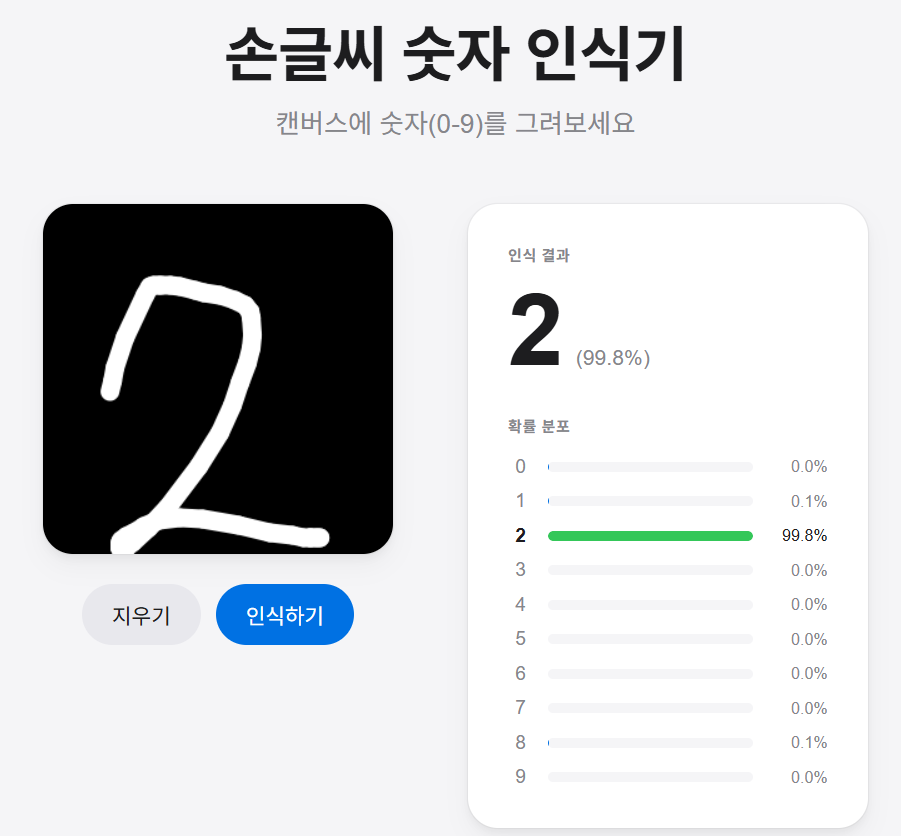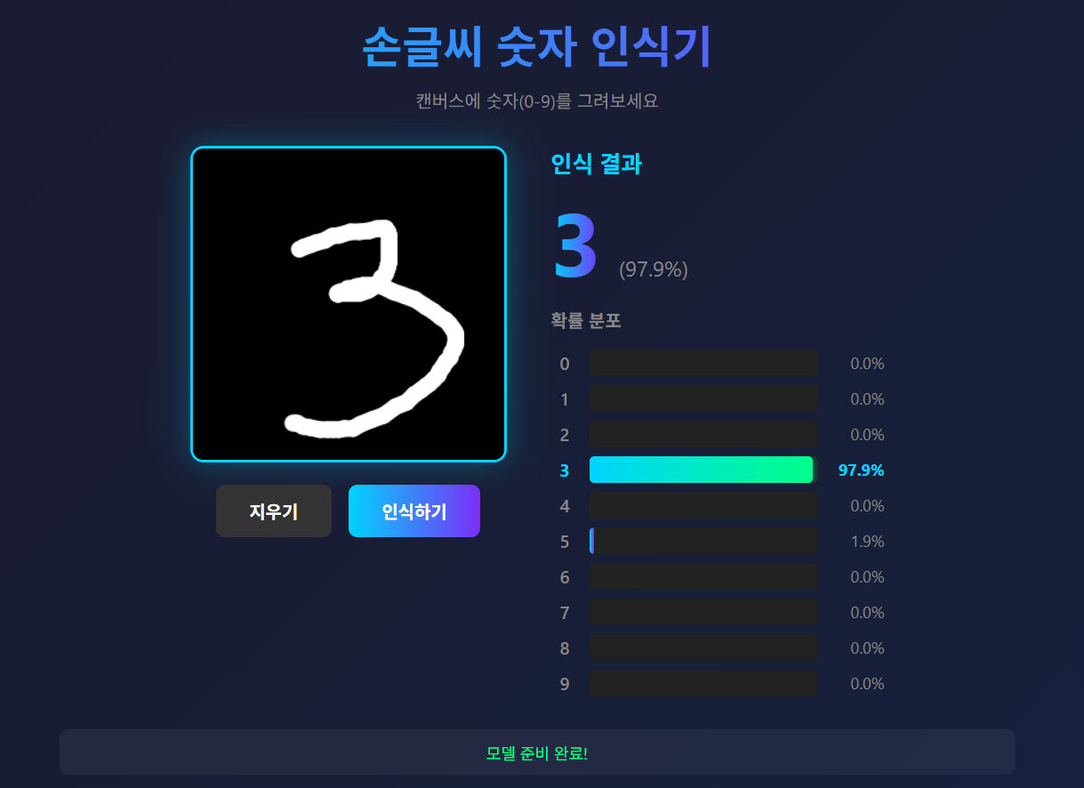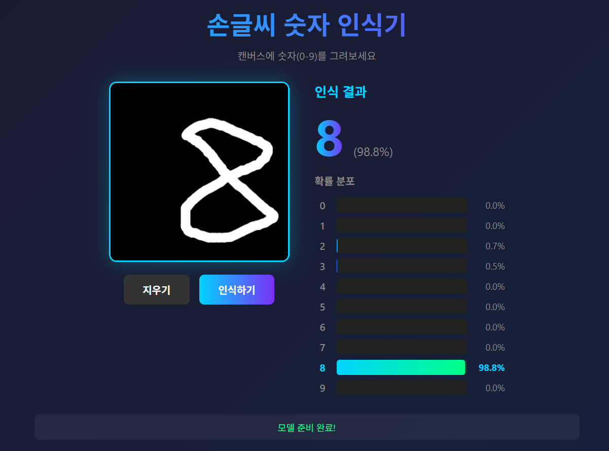 - 아무튼! 저 검은색 배경에 직접 숫자를 그리면 그 글자가 어떤 숫자인지 판별해서 결과로 알려줍니다.