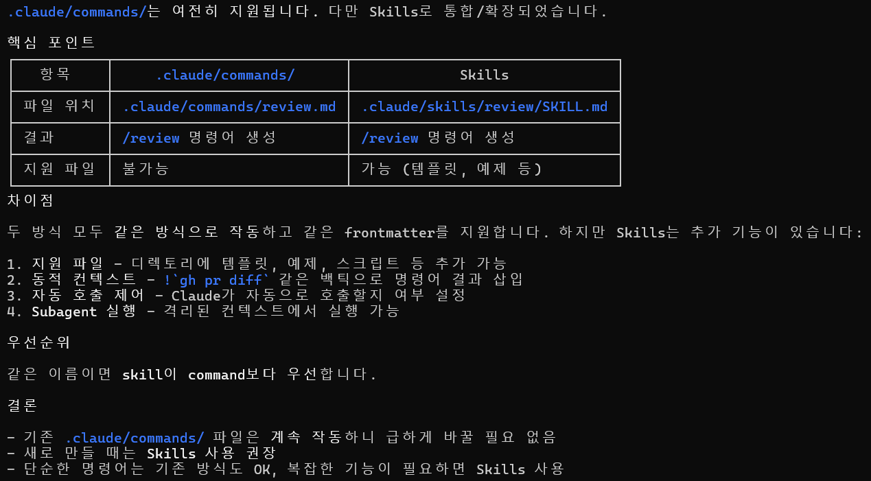 - 따라서 통합 명령어처럼 복잡한 작업을 시도할 때 skills가 훨씬 안정적이겠죠?