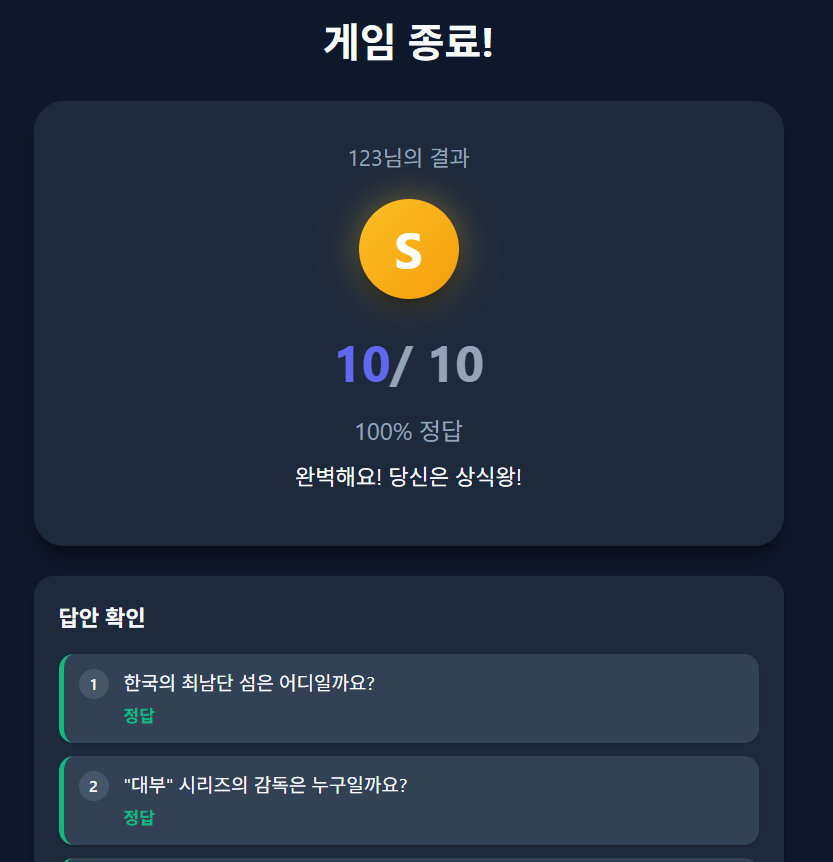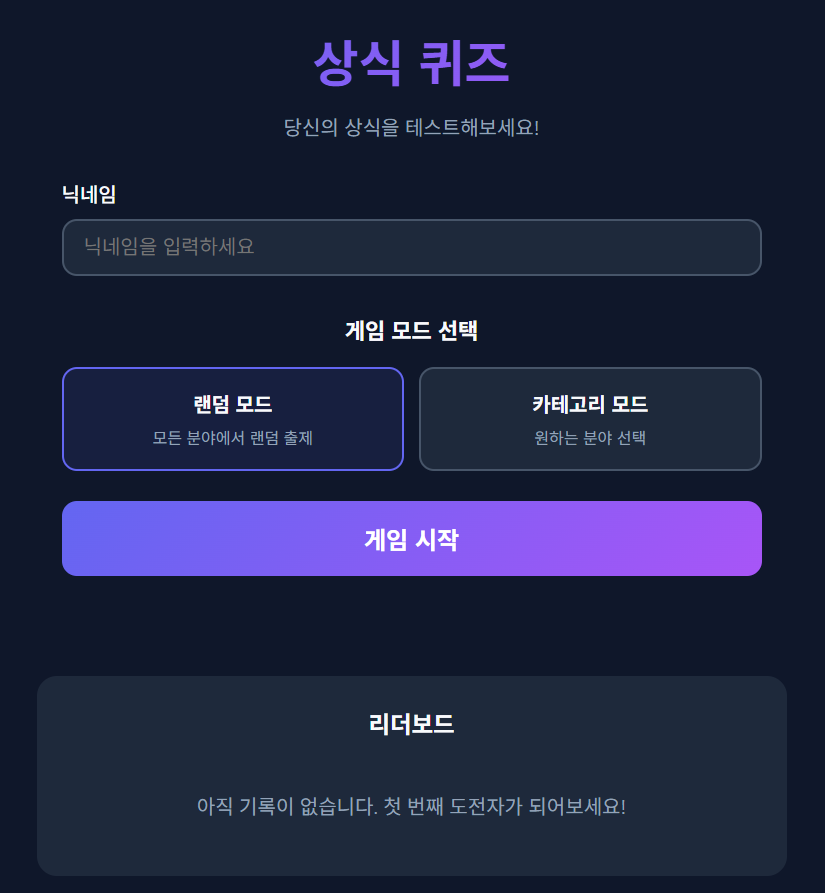 - 다음으로 퀴즈 페이지입니다. 닉네임을 입력하고, 모드를 골라 시작하게 되는데요.