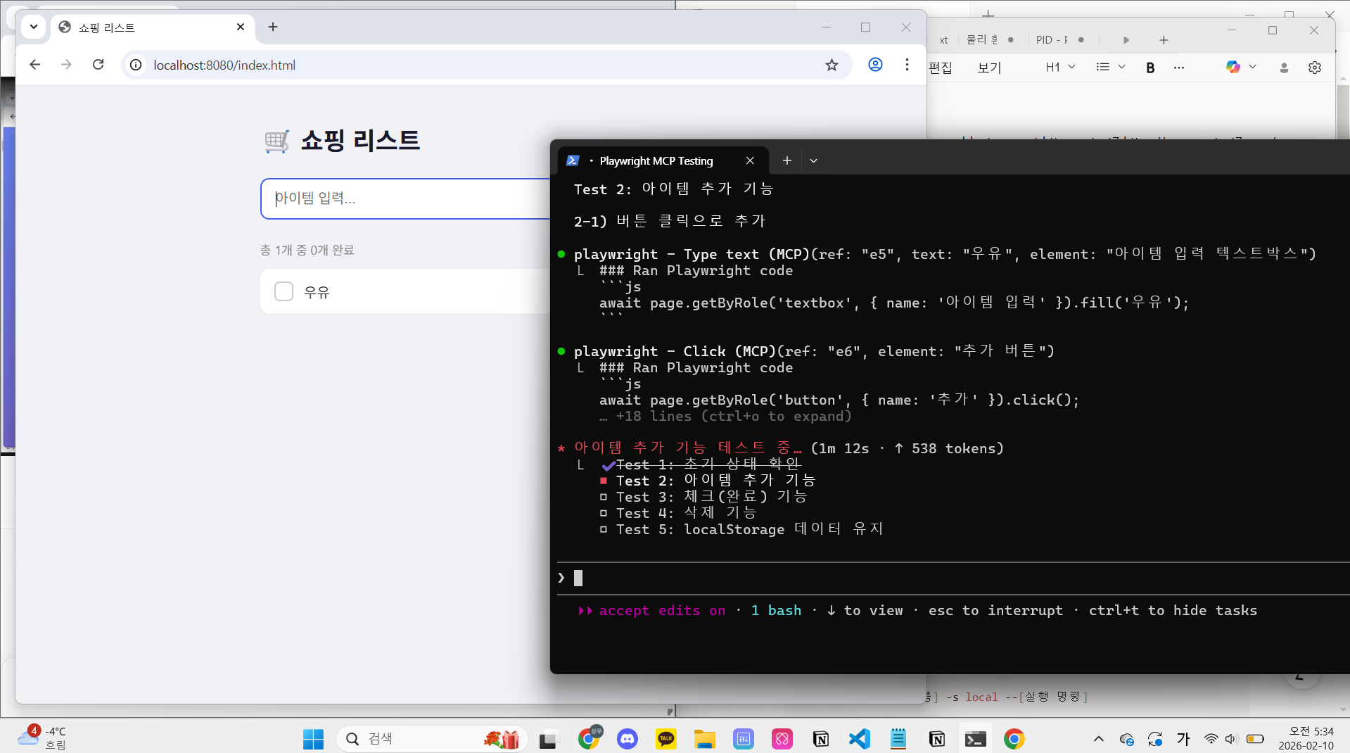 - 이번 시간엔 여러 가지 MCP를 연동해 보았는데, 그중 웹 자동 테스트 도구인 playwright를 사용하는 모습입니다.
